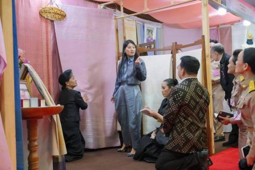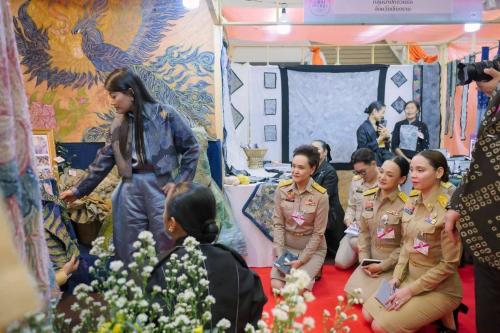 เมื่อเสด็จเข้าสู่หอประชุมมหาวิทยาลัยเชียงใหม่ ทรงพระดำเนินทอดพระเนตรนิทรรศการและการจัดแสดงผลงานภูมิปัญญาผ้าไทยและงานหัตถกรรมชุมชน จำนวน 30 บูท จากกลุ่มผู้ผลิตและผู้ประกอบการในพื้นที่ภาคเหนือและจังหวัดต่าง ๆ ทั่วประเทศ อาทิ กลุ่ม Ninechaidee จังหวัดเชียงใหม่ กลุ่ม Piyasila เสื้อผ้าชาวเขา จังหวัดเพชรบูรณ์ กลุ่ม Phuwida จังหวัดเชียงราย กลุ่มคูลเพียว สันกำแพง จังหวัดเชียงใหม่ กลุ่ม Craft Studio Brand Jinja จังหวัดพะเยา ปูรณฆฏะผ้าไทย จังหวัดลำพูน กลุ่มญเนศ ไทยดีไซน์ จังหวัดแพร่ กลุ่มผ้าปักด้วยมือ จังหวัดเชียงราย ห้องเสื้อเมย์ จังหวัดเชียงใหม่ รวมถึง B.Y.K. บ้านคุณยาย (ย่านเก่าวังกรด) จังหวัดพิจิตร และกลุ่มผู้ผลิตผ้าไหมยกดอกและหัตถกรรมจากจังหวัดลำพูน ตลอดจนกรมหม่อนไหมและสมาชิกศิลปาชีพ