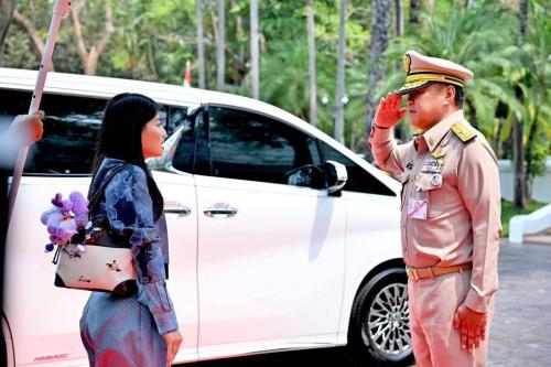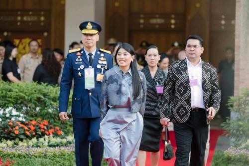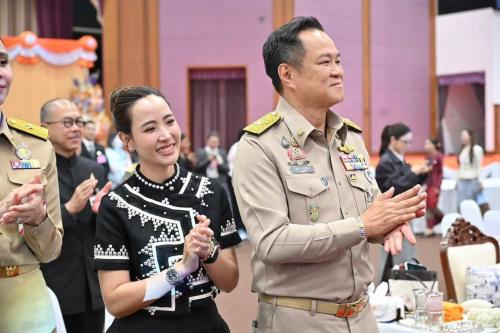 ในการนี้ นายอนุทิน ชาญวีรกูล นายกรัฐมนตรีและรัฐมนตรีว่าการกระทรวงมหาดไทย พร้อมด้วยนางสาวธนนนท์ นิรามิษ ประธานกรรมการคู่สมรสคณะรัฐมนตรีและที่ปรึกษากิตติมศักดิ์สมาคมแม่บ้านมหาดไทย นางศุภจี สุธรรมพันธุ์ รัฐมนตรีว่าการกระทรวงพาณิชย์ นางสาวซาบีดา ไทยเศรษฐ์ รัฐมนตรีว่าการกระทรวงวัฒนธรรม นางสาวศศิธร กิตติธรกุล รัฐมนตรีช่วยว่าการกระทรวงมหาดไทย นายอรรษิษฐ์ สัมพันธรัตน์ ปลัดกระทรวงมหาดไทย นางจิณณารัชช์ สัมพันธรัตน์ นายกสมาคมแม่บ้านมหาดไทย นายสยาม ศิริมงคล อธิบดีกรมการพัฒนาชุมชน นางอรจิรา ศิริมงคล อุปนายกสมาคมแม่บ้านมหาดไทยและประธานชมรมแม่บ้านพัฒนาชุมชน ศาสตราจารย์ปฏิบัติ ดร.เอกชัย มหาเอก รองอธิการบดีมหาวิทยาลัยเชียงใหม่ ผู้บริหารระดับสูงของกระทรวงมหาดไทย ผู้ว่าราชการจังหวัดภาคเหนือ ประธานแม่บ้านมหาดไทยจังหวัด ข้าราชการ สมาชิกแม่บ้านมหาดไทย คณะที่ปรึกษาโครงการ “ผ้าไทยใส่ให้สนุก” ผู้ประกอบการ และสมาชิกศิลปาชีพจากจังหวัดต่าง ๆ เฝ้ารับเสด็จ